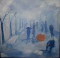 Tecnica mista su tela - Anno 2012 - Nella grandi città l'uomo è solo anche tra la folla, distratto si affretta senza guardarsi intorno, senza soffermarsi e senza sorridere ai bimbi, per lui non esiste il cielo, non esistono le nuvole, non riesce a vedere nulla, è preoccupato solo di correre, correre, correre…